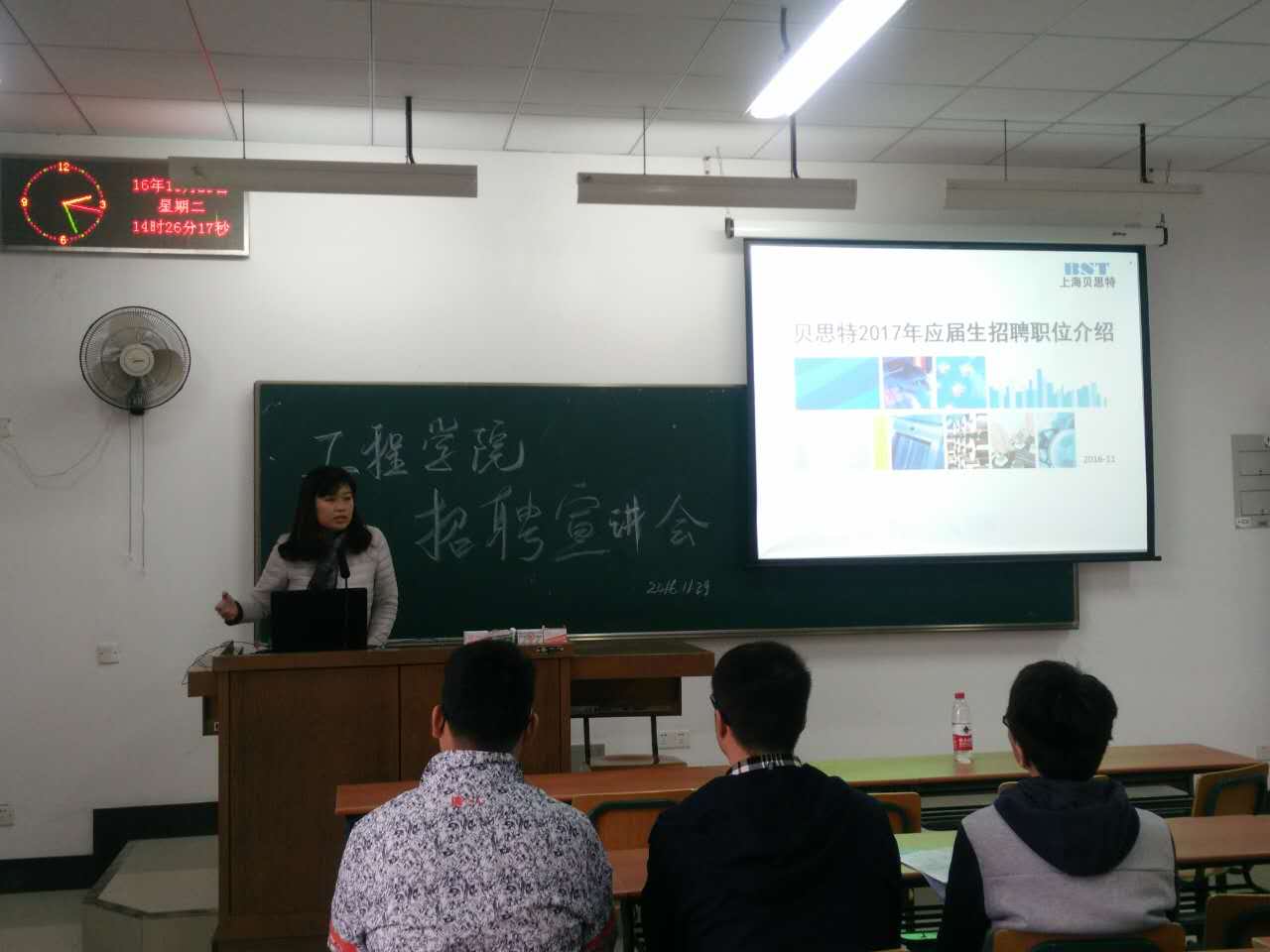 2016年11月29日14点,vwin德赢ac米兰官方网在2308教室举行了上海贝思特电气有限公司宣讲会。上海贝思特电气有限公司技术部、人事部等相关人员,以及毕业班部分学生参加了本次宣讲会。本次宣讲会以上海贝思特电气有限公司的基本情况以及对招聘对象的要求为主题,同各位同学进行了沟通交流。