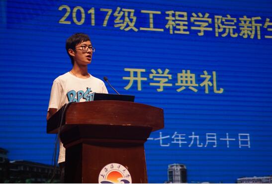 接下来2017级工业1班吕咏蔚和2014级机制1班袁欣伟分别作为新、老生代表进行了发言,新生代表建议大家明确目标,坚定信念,常怀感恩之心,不断奋进。老生代表袁欣伟号召新生“志存高远、念念不忘、躬身实践、必有回响”。随后,学院电气工程及其自动化系主任周悦老师作为教师代表做了发言,周老师希望同学们心怀梦想,脚踏实地,“让海大成为梦想开始的地方,让vwin德赢ac米兰官方网成为梦想开始的基石”。