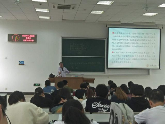 杨教授从民族区域自治制度的建立、成因以及在广西的实践与发展三个方面向同学们详细阐述了民族区域自治制度的巨大优势。在中国的土地上生活着56个民族,维护各民族间的友好关系是国家统一和安全的基础,民族区域自治制度有效的保障了在中央集体领导下各民族依据自身特色进行自我管理、自我服务。