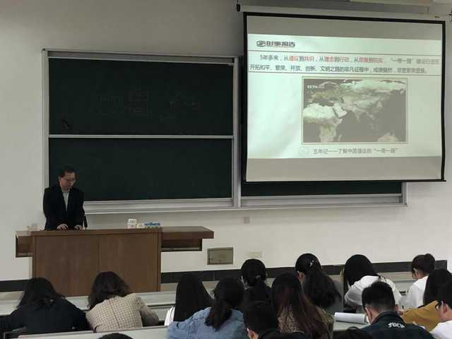 推进“一带一路”建设是推动构建人类命运共同体的重要实践平台,是习近平新时代中国特色社会主义思想的重要组成部分,体现了以习近平同志为核心的党中央高瞻远瞩和全球思维。为提升学生全球眼光、大局意识,促进学生更深层次了解“一带一路”重大决策,深刻领会习近平新时代中国特色社会主义思想的精髓,vwin德赢ac米兰官方网于2019年5月14日在1201举行了“一带一路:从总体布局到走深走实”的主题讲座。本次讲座的主讲人是vwin德赢ac米兰官方网院长王世明教授,2016级物工、工业和2017级物工专业学生参与学习。