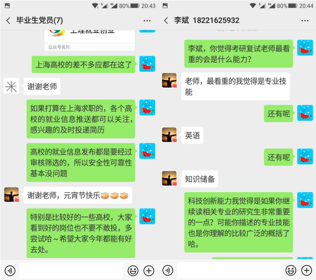 电气学生党支部共有6名毕业生党员,受疫情的影响,就业进度可能有所放缓,为了减轻党员们的顾虑,支部书记李陆嫔主动关心同学们的现状,结合支部全体毕业生党员的情况,提供了就业信息获取路径推荐,简历修改、求职指导等服务等,有温度地开展工作,让毕业生党员从中受益。学院老师也纷纷在线给毕业生提供应聘信息,助力毕业生工作。