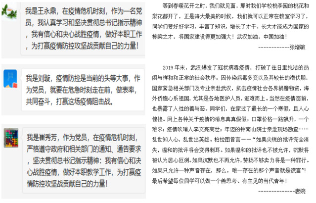 机械工程专业教研室党支部、工程实验中心党支部、工程基础教研室党支部等各支部党员纷纷发表了对疫情的评论和祝福,讨论“践行初心使命、打赢防控战役”的具体方法,努力在疫情防控中当做先锋、做出表率。