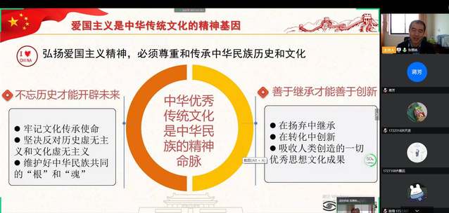 讲座中,张书记强调爱国主义是中华民族生生不息的力量源泉,具有鲜明时代的历史范畴,是中华文化的精神基因,明确弘扬爱国主义精神就要把传承中华优秀传统文化同培育和践行社会主义核心价值观统一起来,以优秀传统文化滋养社会主义核心价值观,进而形成激扬爱国主义的强大力量。回顾祖国发展的同时,张书记结合今年疫情防控战争,向同学们展示了在疫情防控期间国家拥有的强大动员体系和执行能力,正是因为有这样一个强有力的祖国,使我们在最短的时间做到了最有效的管理并控制住疫情的蔓延趋势。大灾大难面前,方显本色,我们应该为生在这样一个伟大的祖国自豪和骄傲。