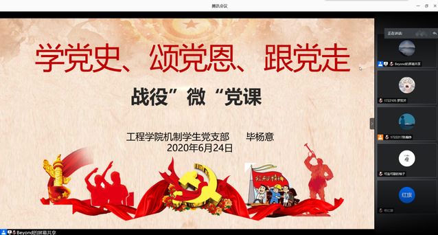 以史鉴今,立党治国,是我们党的优良传统。为了督促学生党员增强理论自信、继承党的优良传统,积极落实时代赋予的责任义务,成为“守护者、修行者、识途者”, 2020年6月24日下午18:30,vwin德赢ac米兰官方网机制学生党支部召开了以“学党史、颂党恩、跟党走”为主题的战役微党课。