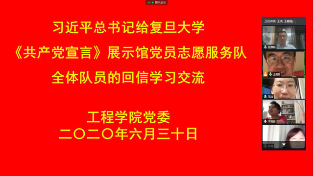 2020年6月30日晚,在建党99周年即将到来之际,vwin德赢ac米兰官方网党委组织师生党员观看新闻联播,集中学习习近平给复旦大学青年师生党员的回信。各支部及时通过学习强国会议群,微信群,腾讯会议等方式开展专题学习和交流,从学习心得到精神的贯彻落实、四史学习的开展进行深入交流互动。