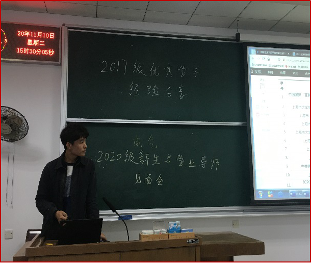学习结束后,组织2020级电气工程及其自动化专业新生与学业导师见面、交流沟通;会上,新生认识了自己的学业导师,并就学习生活中的一系列问题与导师进行了沟通。学业导师从专业角度、过来人的角度给了学生全面的答疑与引导,这对学生尽快适应大学学习生活,确立奋斗目标起到了积极推进作用。并邀请2017级优秀学子李冲、朱钜宝两位同学分享学习、科创等经验。2020级新生初来乍到,对科创、学科竞赛充满好奇。兴趣是最好的老师,同时为了帮助学生形成良好班风,特邀请2017级优秀学子李冲和朱钜宝同学分享自己在学习、科创等方面的经验。李冲同学以全院第一名的成绩报送到复旦大学,即将攻读硕士学位;朱钜宝同学学习和动手能力特别强。两位同学从自己大一入学说起,谈自己的学习方法和理念、科创的意义和方法、学科竞赛的种类和参赛经验等等,这对2020级新生后续学习和科创等非常有帮助。两位优秀学子还现场回答了同学们提出的各种问题,会场气氛热烈,反映良好。