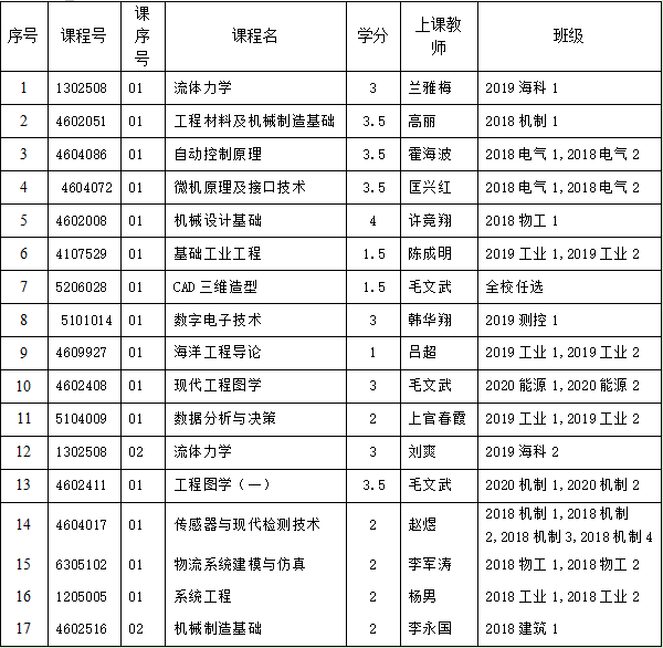 根据教务处﹝20秋﹞第(15)号2020-2021学年秋季学期关于启动“好课堂”创建评选活动的通知,经个人申请、学院领导和督导评分、学院教学工作委员会评审,拟向教务处推荐以下17门课程创建“好课堂”,清单如下: