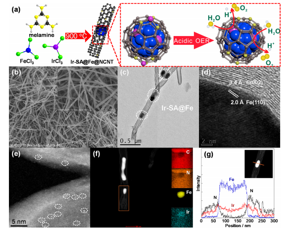 该论文是我校vwin德赢ac米兰官方网许竞翔副教授与中国地质大学杨泽惠教授团队、日本电气通信大学赵晓博士团队合作,于2020年发表在国际高水平学术期刊《Nano Letter》上的研究成果。论文针对酸性电解水制氢技术中单原子催化剂耐久性差的问题,提出通过将铱原子分散在纳米铁颗粒内和表面并将IrFe纳米颗粒嵌入到掺杂氮的碳纳米管(Ir-SA@Fe@NCNT)中,从而提升单原子催化剂的稳定性。在酸性电解液中,该催化剂仅需要250 mV过电位析氧电流密度达到10 mA cm-2,其在过电位为270 mV时的质量活性是商业化IrO2的1370倍,实现了高效利用率,这一技术的实现也为开发海洋可再生能源电解水制氢技术奠定了基础。