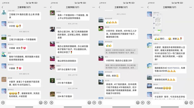3月13日凌晨,vwin德赢ac米兰官方网微信群仍然不断有新消息出现,“我办公室靠门口有新准备的折叠床,请随时去取”“我办公室有折叠躺椅,可以直接去拿”“A组老师辛苦了,需要专车司机接送的联系我,我随叫随到”……为备战校园准封闭状态,确保师生顺利进行在线教学和期间校园生活,学院已有数十名教工主动请缨报名志愿服务,由于在此期间无法出校,得知消息的院内老师纷纷伸出援助之手,于是出现了上述的暖心一幕。疫情就是命令,防控就是责任。老师们的一腔热血,让工程人的防疫之路充满温情。这一刻,工程人用爱筑牢了防疫新阵线。