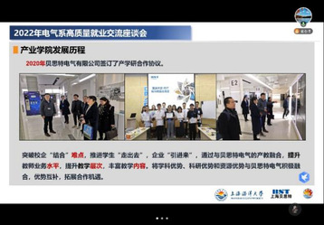 霍海波简单介绍与贝思特合作的有关政策,通过与贝思特电气的产教融合,将学科优势科研优势和资源优势与贝斯特电气积极融合,优势互补,扩展合作机遇,突破校企结合难点,推进学生“走出去”,企业“引进来”,提升教师业务水平和教学层次,丰富教学内容。谢嘉则从公司与学校在实训、技能培养方面的合作谈了自己的想法。刘雨青表示通过本学院在贝思特的实习生宣传,让低年级同学了解企业 ,形成从学校到企业再到学校的闭环培养。董兆鹏对到访的贝思特电气有限公司的嘉宾表示感谢,期待日后双方能深化校企合作,在学生实习、教师科研合作、产学研等方面能有更大的合作机会。