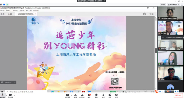 上海华力人力资源部副部长苏瑞琴介绍了半导体科技应用热点,国内集成电路产业链,通过华力的人才政策与环境、人才培养与晋升体系和2023届定向招募计划,让同学们亲身感受到华力的魅力。2021级机械工程专业校友孙涛,以“我和华力”的形式向同学们分享了他在华力的快乐成长过程,鼓励学弟学妹们努力拼搏。华力HR王昇还带领参加宣讲的老师和同学们“云游”华力公司,感受华力的企业文化。