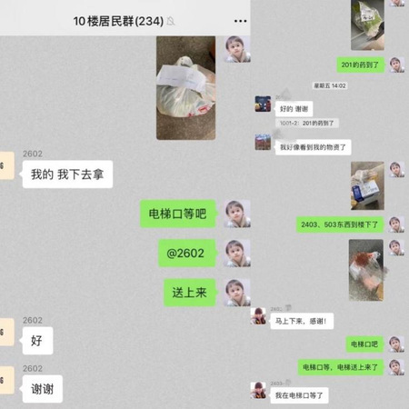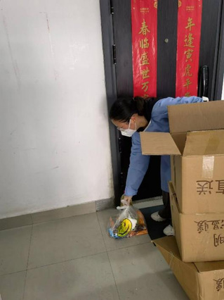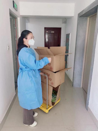 由于楼栋属于封控楼,等社区志愿者将居民购买的物资送到楼栋后,曹婧妍作为楼栋志愿者,主要负责对物资进行消杀、静置,再在楼栋群中通知到购买物资、药品的居民,进行无接触分发,确保居民可以及时拿到自己的物资。在送物资的过程中,很多时候会因为大门口的物资不能及时送达楼栋,居民会在楼栋群中询问,志愿者们都会耐心地核对门牌号,告知物资是否送达,每当将物资顺利送到居民手中时,听到楼栋群中一声声“谢谢”,总是感到十分欣慰。高层楼栋住户多,情况复杂,老年人群也不少,遇到不会使用手机的老人,做到把物资送到他们门口,敲门告知后再离开,无接触地把物资送达。遇到楼栋居民组织团购时,帮忙搬运商品,及时消杀外盒,并协助团长核对团购商品,分发到每位参加团购的居民的手中。
