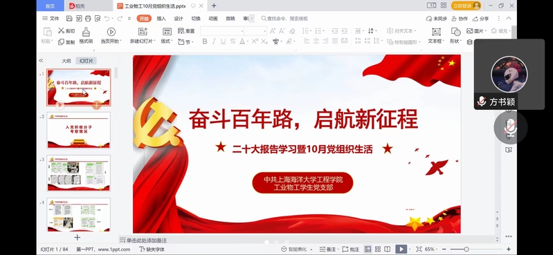 2022年10月28日,工业物工学生党支部全体正式党员、预备党员在线下vwin德赢ac米兰官方网楼302,线上腾讯会议两个会场开展了工业物工十月党组织生活,会议上认真学习了党的二十大报告,党员和预备党员分别谈谈个人感想,同时学习了新党章内容。
