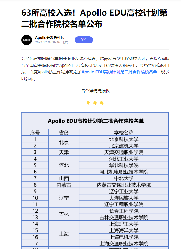 2022年12月7日,百度公布Apollo EDU高校计划第二批合作院校名单,全国共63所院校入选,上海市入选4所院校,我校在众多申请院校中脱颖而出、成功入选。百度Apollo EDU高校计划旨在通过深度校企合作助力院校开设自动驾驶相关课程及专业,加速人工智能领域工科科技人才的培养进程。