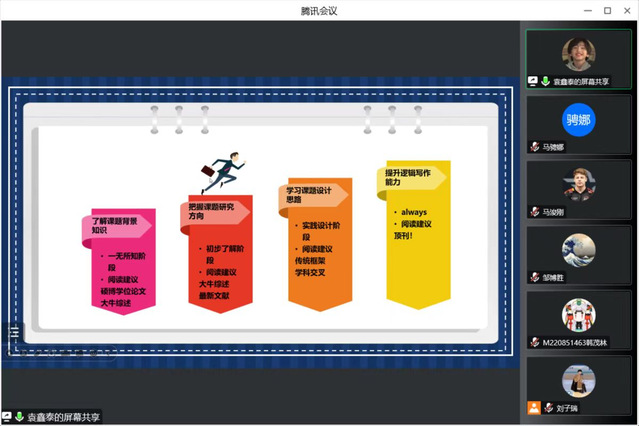 袁鑫泰是研究生二年级的优秀学生,现任vwin德赢ac米兰官方网研究生第二党支部副书记,曾获国家奖学金一等学业奖学金、“三好学生”、“华为杯”研究生数学建模三等奖,发表SCI四篇,同时还发表了EI、CSCD核心、卓越期刊等。袁鑫泰以“学如登山,以足量之”为题,就硕士规划方面,向大家详细介绍了不同时间段所需要考虑和完成的任务,并且为大家梳理了创新的不同方式,在分享中强调了科创的重要性,鼓励研究生们要坚定信念,不断学习新知识和技能,坚持阅读顶刊论文,合理利用文献阅读软件,找准方向,才能在科技创新领域中有所建树。
