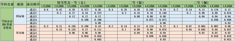 ⑤以团队获得奖励荣誉的,按照贡献度依次计算绩点,各成员绩点分配比例见附表3。