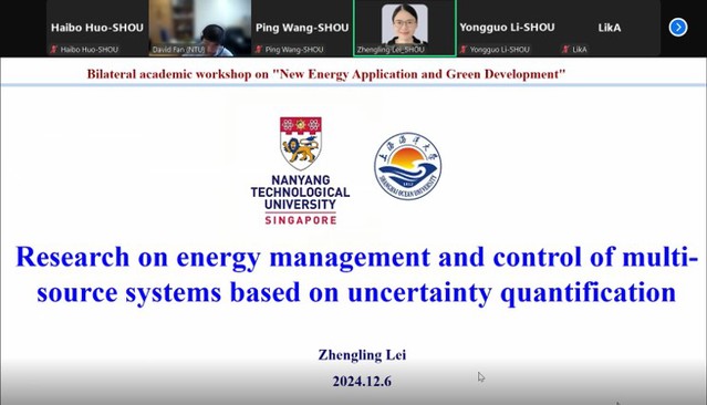 为推进vwin德赢ac米兰官方网与南洋理工大学机械与宇航学院在科学研究领域的国际交流与合作,2024年12月6日8:45-15:15两校在线举办了学术交流会。本次交流会的主题围绕“新能源应用与绿色发展”,旨在进一步加强双方合作交流,凝练未来合作发展方向,以促进双方在新能源低碳转型方面的沟通交流,并充分讨论碳中和目标下绿色可持续发展面临的机遇与挑战。会议分别由vwin德赢ac米兰官方网王平教授与南洋理工大学范峥教授主持。我校上海海洋可再生能源工程技术研究中心主任许竞翔教授、王平教授、霍海波副教授、李永国副教授和雷正玲助理教授参会并做主旨报告。