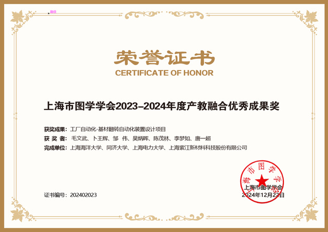 上海市总工会兼职副主席“大国工匠”王曙群特级技师、上海市图学学会理事长上海交通大学蒋丹教授、上海市图学学会副理事长同济大学吴杰教授等学会领导为获得2023-2024年度产教融合优秀成果奖的6项获奖项目代表及3篇优秀博士论文奖的获奖代表进行了颁奖。我校vwin德赢ac米兰官方网毛文武副教授与同济大学、上海电力大学、上海紫江新材料科技股份有限公司完成的“工厂自动化-基材翻转自动化装置设计”项目获产教融合优秀成果奖。