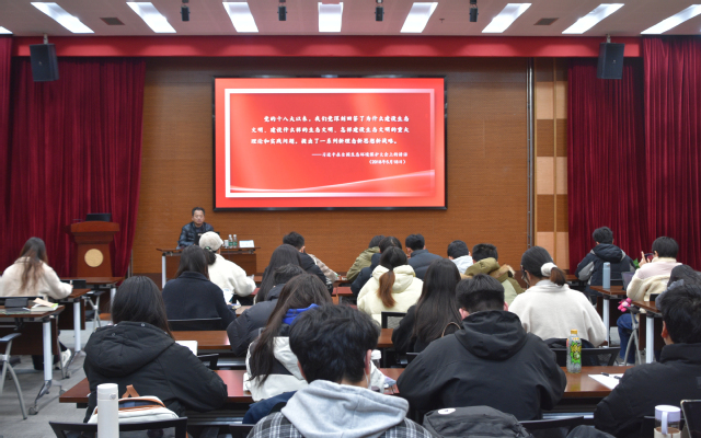 施永忠从国内外触目惊心的生态环境破坏案例开篇,以“十个坚持”为核心框架,以生动语言系统阐释习近平生态文明思想的理论体系,以鲜活案例深刻阐述习近平生态文明思想的科学内涵和理论精髓,内容涵盖党对生态文明的领导、生态文明的辩证关系、“绿水青山就是金山银山”的方法论创新、习近平生态文明思想形成发展和新时代生态文明建设成效。他总结了学院师生在生态环境领域作出的努力和取得的成果,希望学生党员们充分认识到生态文明建设的重要性,带动周围同学认真学习党的理论知识,将党的创新理论转化为推进生态文明建设的强大动能。
